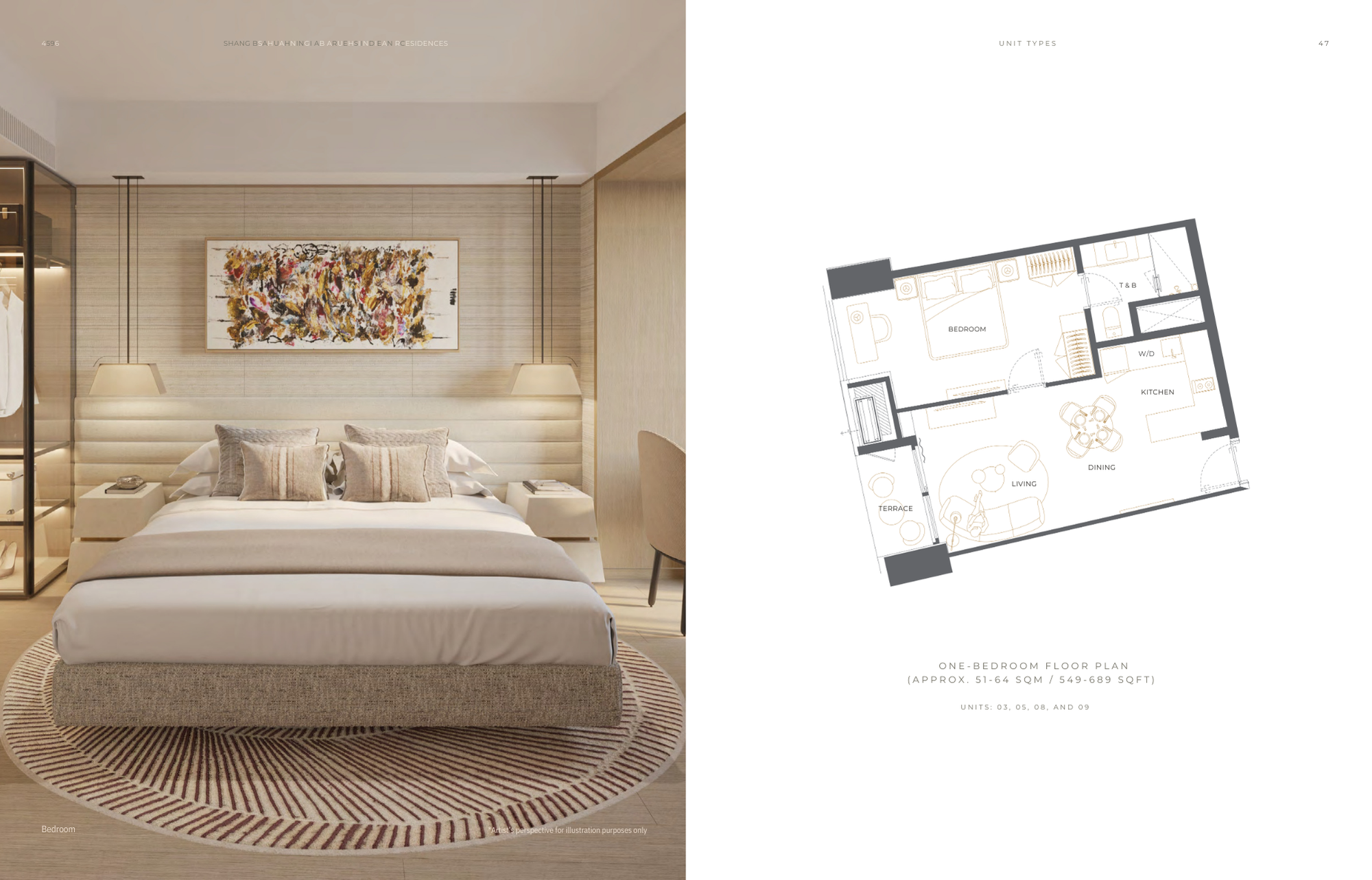 • 1-Bedroom (Approx. 51 – 64sqm / 549 – 689sqft)